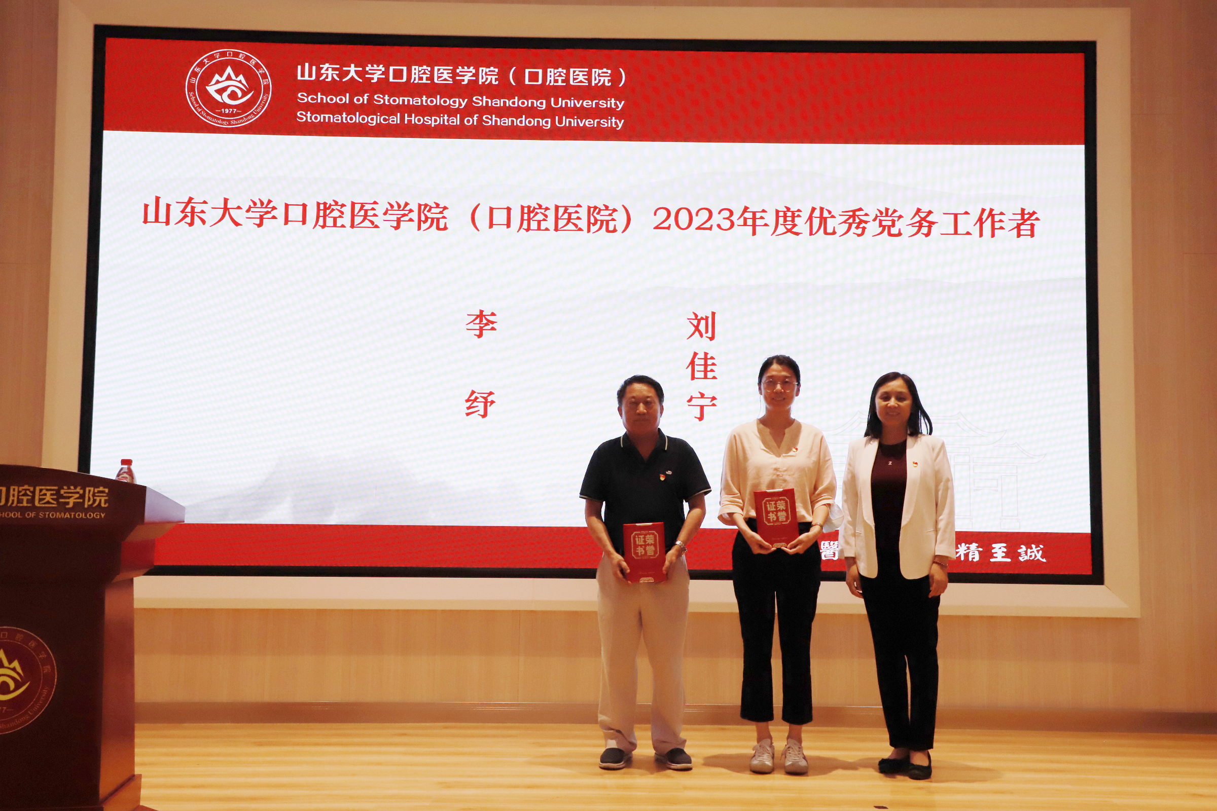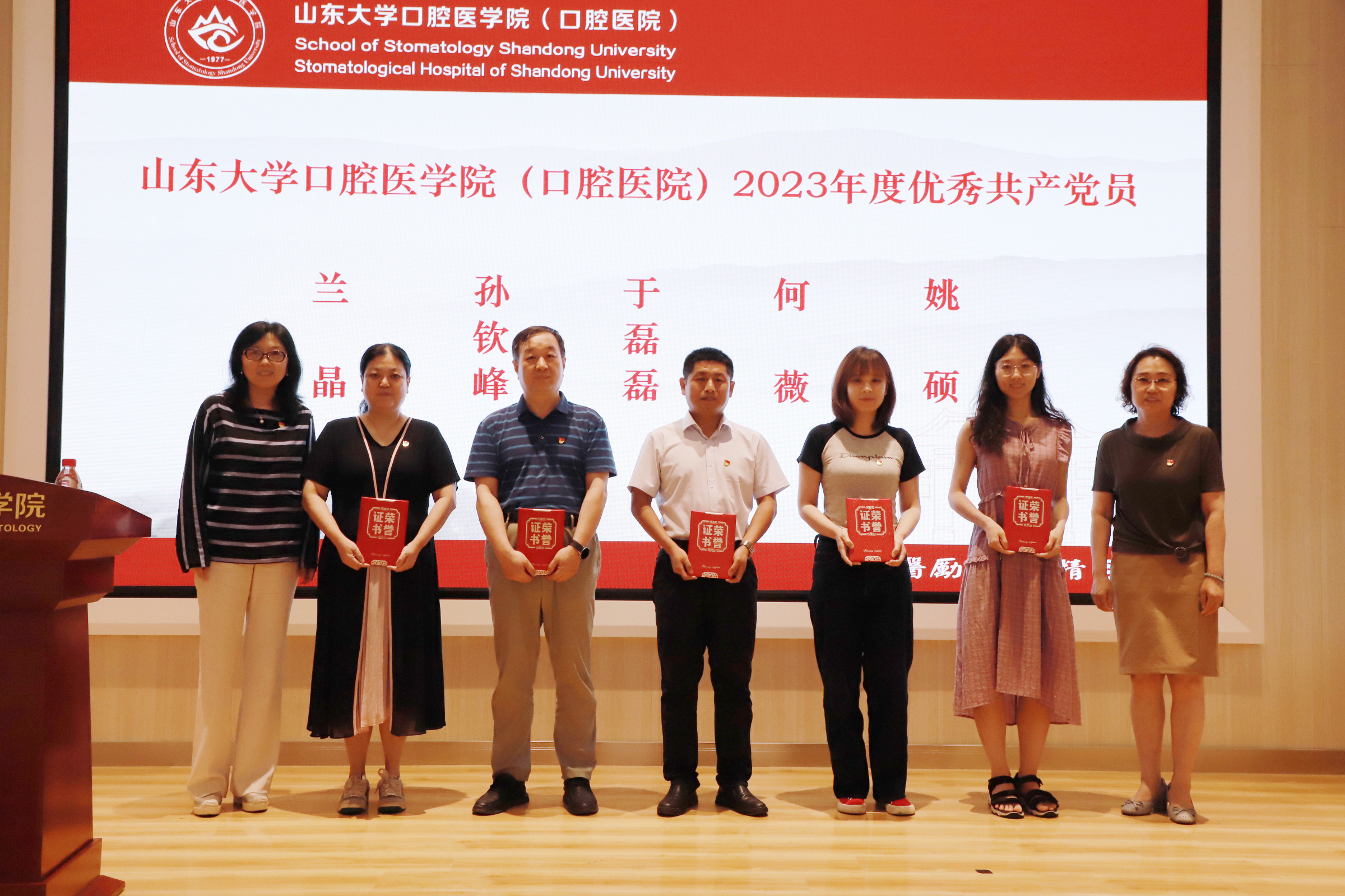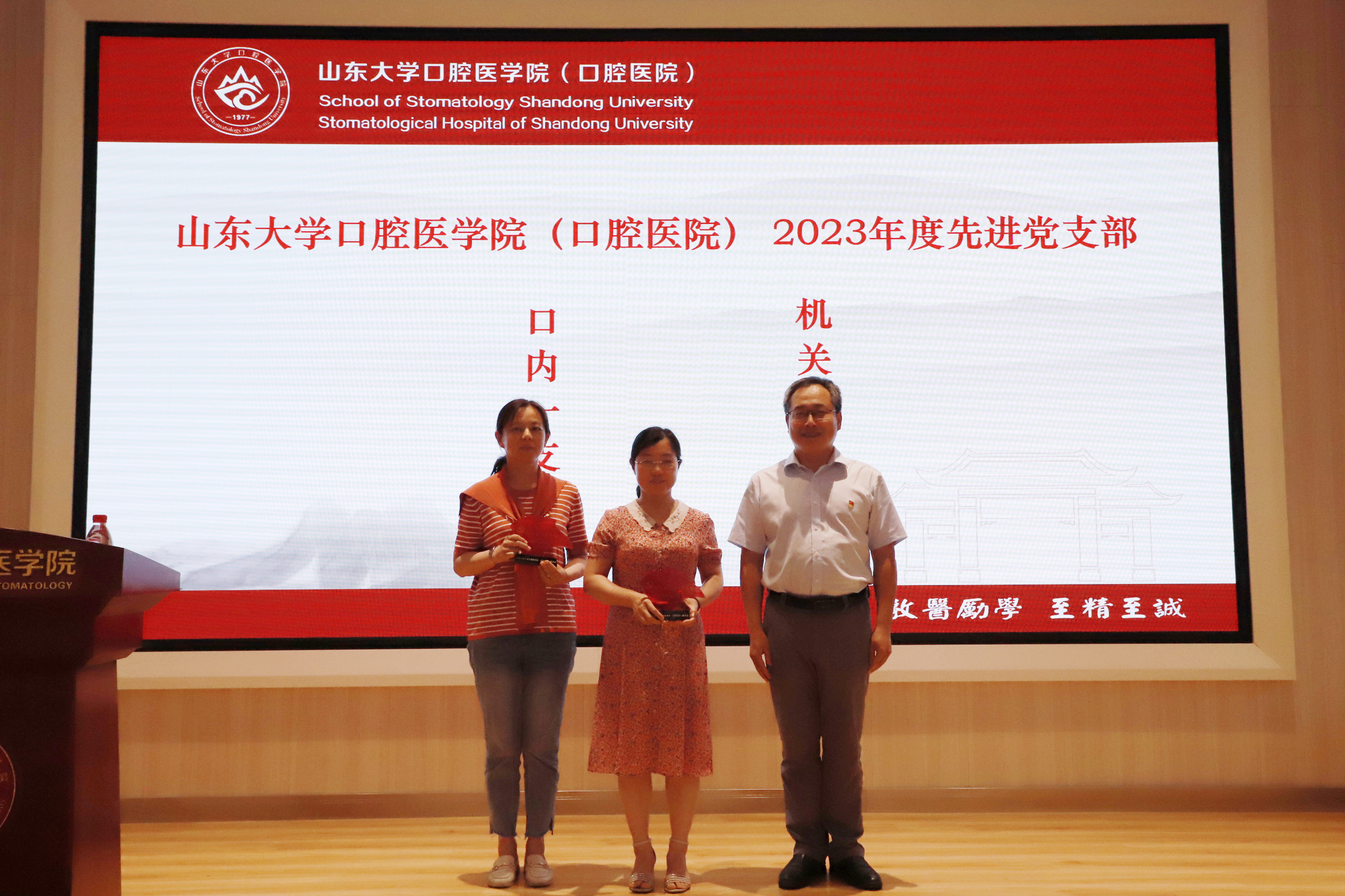 会上,学院(医院)党委副书记齐山华宣读了《关于表彰优秀共产党员、优秀党务工作者和先进党支部的决定》。总会计师李彤冰,党委副书记、纪委书记王巍巍,副院长宋晖,副处级组织员张海燕分别为获得“山东大学口腔医学院(口腔医院)优秀共产党员”荣誉称号的兰晶、孙钦峰、于磊磊、何薇、姚烁,获得“山东大学口腔医学院(口腔医院)优秀党务工作者”荣誉称号的李纾、刘佳宁,获得“山东大学口腔医学院(口腔医院)先进党支部”荣誉称号的口腔内科第一党支部、机关第一党支部代表颁奖。获奖代表兰晶、于磊磊和中层干部代表刘东旭、张瑾、吕艾芹先后作了典型发言,交流了主题教育工作开展情况。