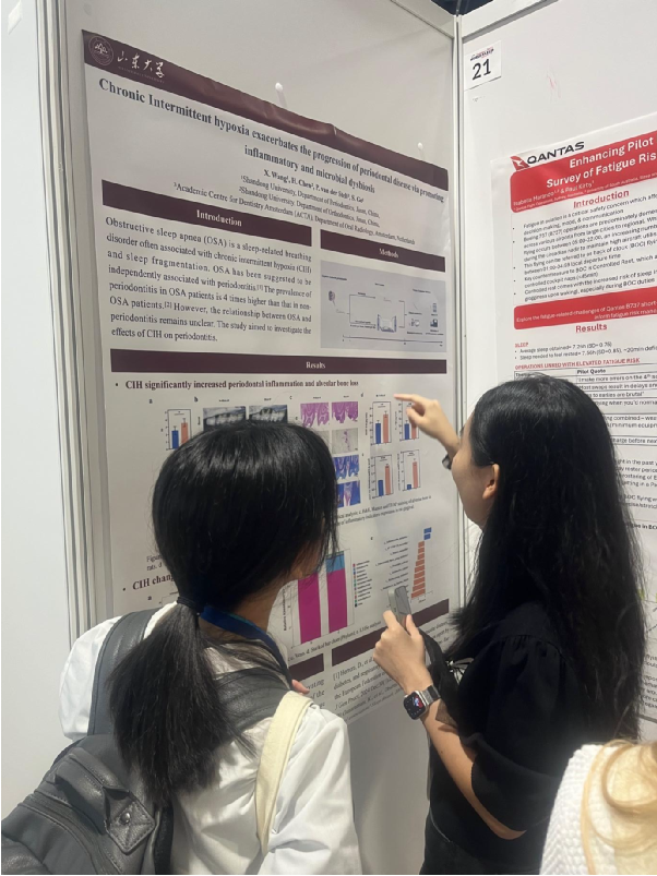 陈荟参与“阻塞性睡眠呼吸暂停OSA的口腔矫治器治疗:个体化诊疗的跨学科方法”分论坛讨论,并做“口腔矫治器治疗与其他阻塞性睡眠呼吸暂停治疗方式的比较:识别疗效影响因素”大会口头发言;在磨牙症分会场,李德水参与“夜磨牙,口腔颌面疼痛,失眠与OSA的相互关系”分论坛讨论,并做“从磨牙到呼吸:探索磨牙症与OSA的相关关系”大会口头发言;王熙做“一种新型口腔矫治器治疗OSA的疗效与作用机制研究”“慢性间歇性缺氧加重牙周炎的机制研究”壁报展示。