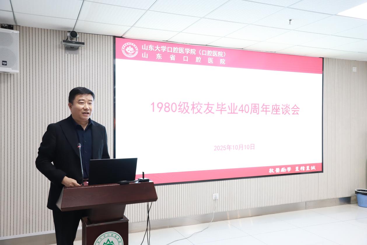 张青代表学院(医院)对1980级校友荣归母校表示热烈欢迎。他表示,1980级校友作为建系早期的口腔学子,是学院发展的亲历者,校友们扎根全国各地,以仁心守护口腔健康,用实干贡献行业,为母校赢得了广泛声誉,是全院师生学习的榜样。他强调,学院(医院)正处在改革发展关键时期,诚邀校友们积极参与学院(医院)发展建设,共同助力山大口腔医学事业迈上新台阶。