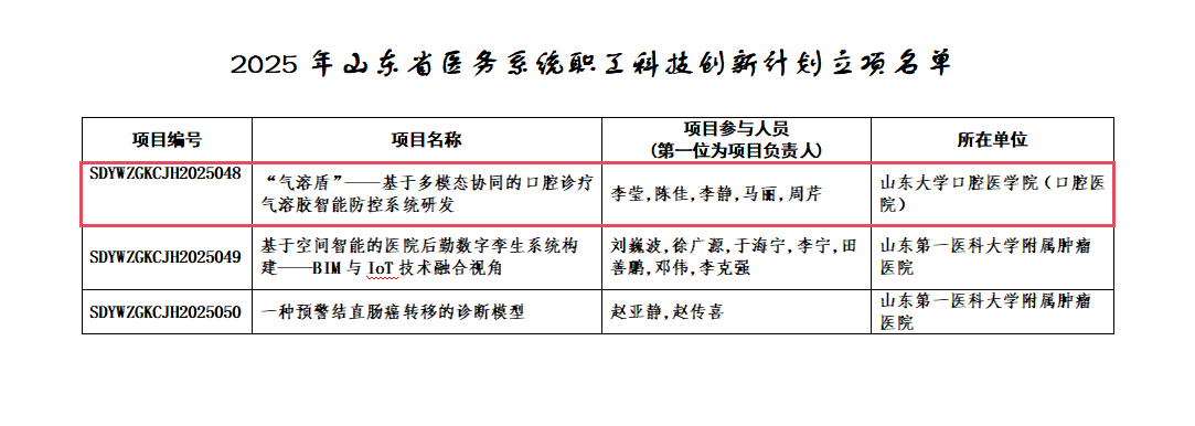 在“鲁医创新杯”创新创效竞赛中,由我院保健二科李莹作为项目负责人申报的《“气溶盾”——基于多模态协同的口腔诊疗气溶胶智能防控系统研发》项目,成功入选山东省医务系统职工科技创新计划并获立项。该项目直面口腔诊疗实践中感控的痛点与难点,致力于研发具有自主知识产权的智能化气溶胶防控系统,兼具前瞻性创新性与临床实用性,为进一步提升医疗质量、保障患者健康注入新动能。