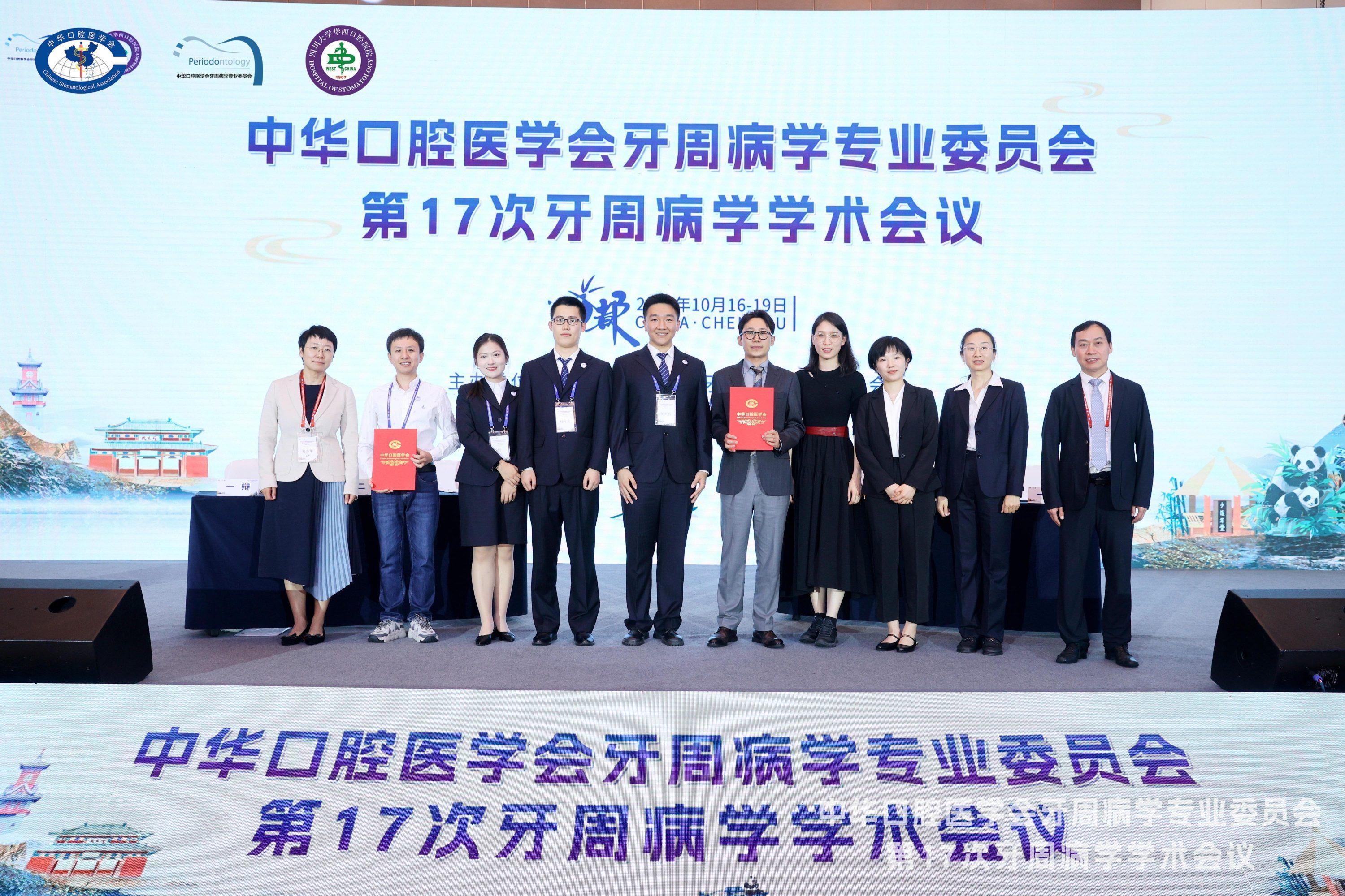 除此之外,张礼国、陈玮玉分别在牙周再生与基础研究专场、见微知著-牙周微生物与免疫进展前沿专场作了原位矿化屏障膜调控细胞衰老增强引导骨再生、IMP2促进牙周炎中PDLSCs葡萄糖代谢重编程影响其增殖分化的机制探究的口头汇报。韩菁、刘小佳、张龄月等则通过壁报展示了具有本征压电性的胶原支架增强骨再生的作用及机制研究、钛酸钡热释电促进种植体周骨感知和骨结合及其机制研究、多酚-大黄酸自组装纳米颗粒阻断活性氧-炎症循环治疗牙周炎等方面的前沿研究。张小岑、李柠、段小琪、李晓茜等多位医师的临床病例与科普作品,吴倩、张倩、井斐、张晓燕、王冬梅等护理人员的科普作品、护理视频、壁报等在现场进行了展示。
