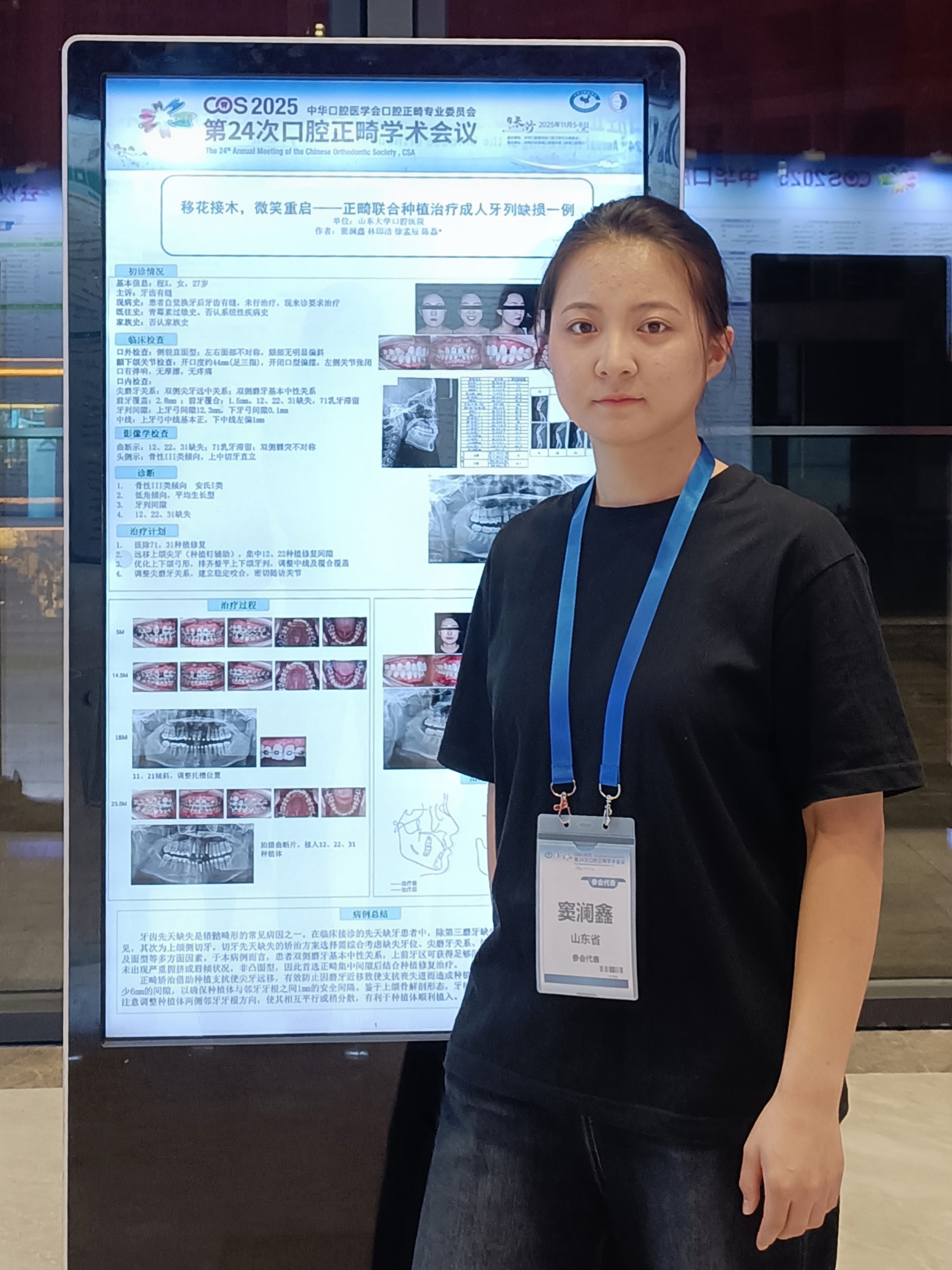 正畸科5名学生入选全国病例壁报展示,研究生崔晓彬(导师:张君教授)《前方牵引矫治器结合双丝法矫治儿童骨性III类伴上颌中切牙倒置阻生一例》;研究生鲁晓昱《成人骨性II类正畸拔牙掩饰性矫治一例》(导师:陈磊教授);研究生林邱洁《拒绝“葛优躺” --一例青少年多颗磨牙阻生的矫治》(导师:陈磊教授);住培生窦澜鑫《移花接木,微笑重启--正畸联合种植治疗成人牙列缺损一例》(导师:陈磊教授);进修生潘青青《去扭转、防复发--一例儿童重度扭转前牙的矫治》(导师:陈磊教授)。所展示的临床案例覆盖儿童早期矫治、成人复杂错颌、多学科联合治疗等多个领域,将诊断思路与治疗过程系统呈现,成为会场中备受关注的亮点。