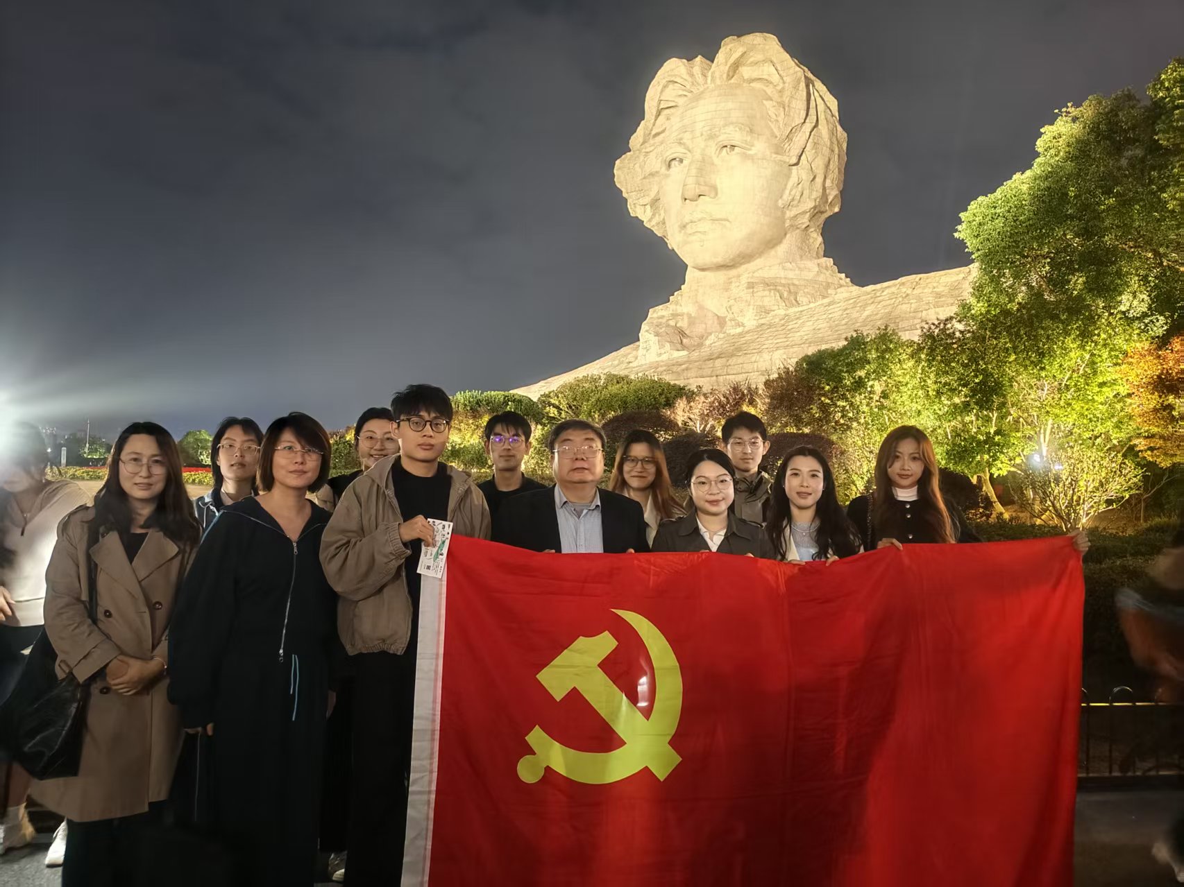 夜幕下的橘子洲头灯光璀璨、湘江奔流不息,巍然耸立的青年毛泽东雕像神情坚定、目光远眺。师生党员们在讲解员引导下,回顾毛泽东从爱国学子成长为点燃革命火种一代伟人的转变历程,深刻感悟湖湘大地孕育的“敢为人先、实事求是”的精神品格,接受了一次直抵人心的红色教育和思想洗礼。在青年毛泽东雕像前,刘东旭带领党员同志面向鲜红的党旗庄严宣誓,重温入党誓词。铿锵有力的誓言回荡在湘江之畔,既是对初心使命的回溯坚守,更是对时代责任的庄严承诺。党员们纷纷表示,要时刻牢记共产党员的初心和使命,把对党忠诚、为民服务、敬业奉献的信念落实到日常学习工作和具体行动中,为人民群众口腔健康保驾护航,为学校和学院(医院)高质量发展贡献更多力量。