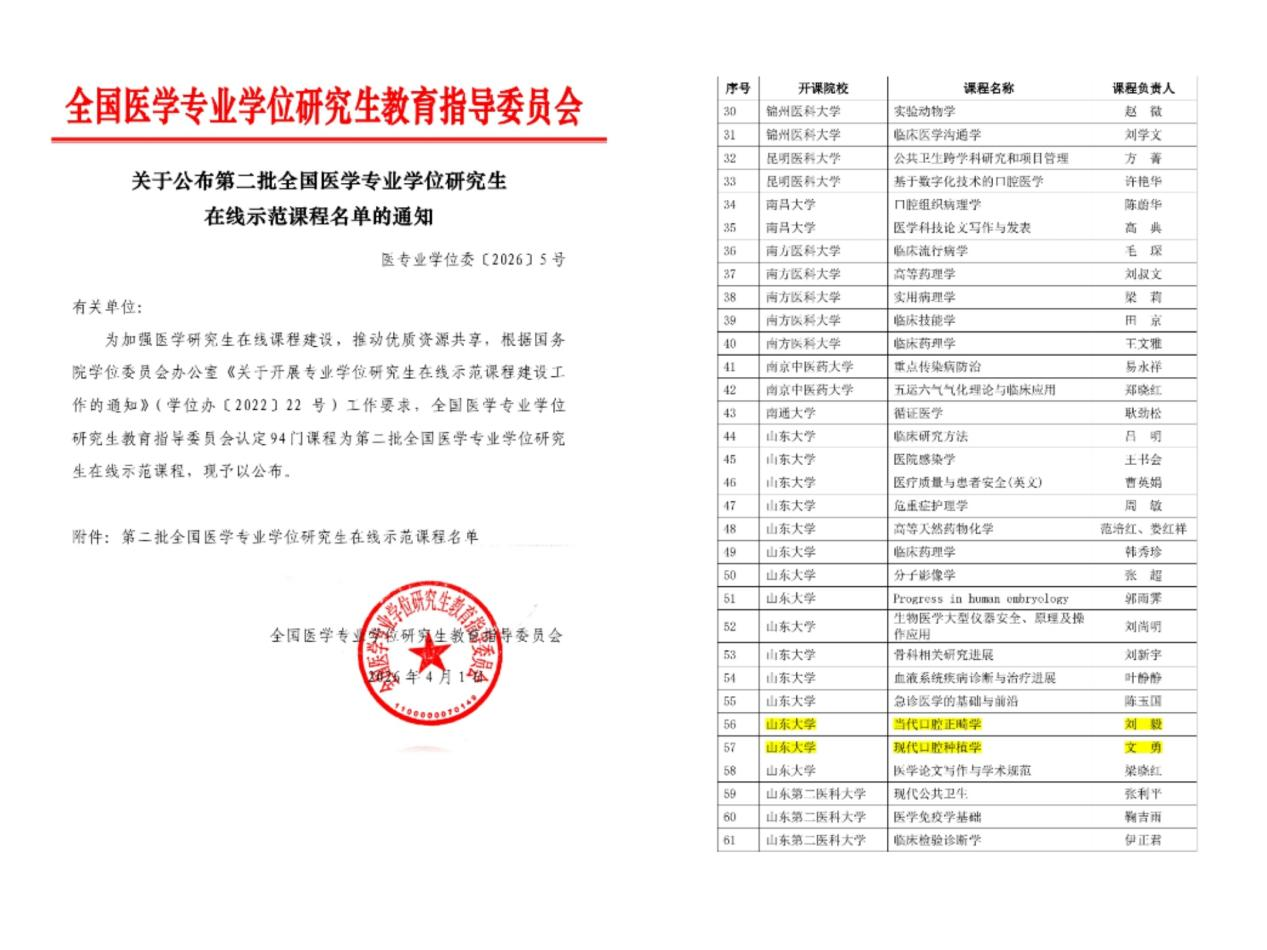 此次入选全国医学专业学位研究生在线示范课程,是对我院相关课程建设质量、教学团队水平及数字化教育资源应用成效的权威认可,展现了我院在研究生课程建设与教育教学改革方面的扎实成效。学院将以此为契机,持续加大课程建设投入,深化教育教学改革,充分发挥示范课程的引领辐射作用,推动更多优质课程资源的建设与共享,不断提升口腔医学专业学位研究生的培养质量,为培养更多高素质、创新型口腔医学人才贡献力量。