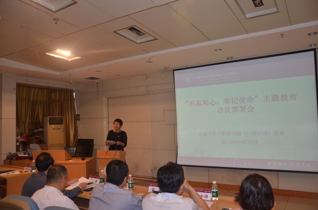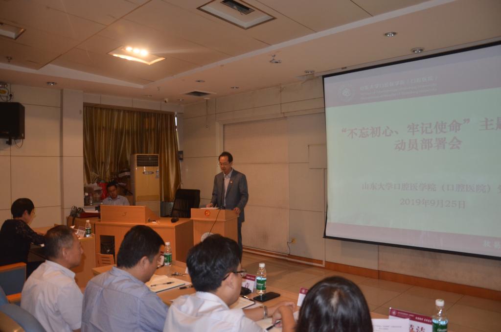 9月25日,山东大学口腔医学院(口腔医院)召开“不忘初心、牢记使命”主题教育动员部署大会,深入贯彻落实习近平总书记关于“不忘初心、牢记使命”主题教育的重要讲话和重要指示批示精神,根据学校统一部署和学院(医院)党委要求,对学院(医院)开展此次主题教育进行动员部署并做出工作安排。