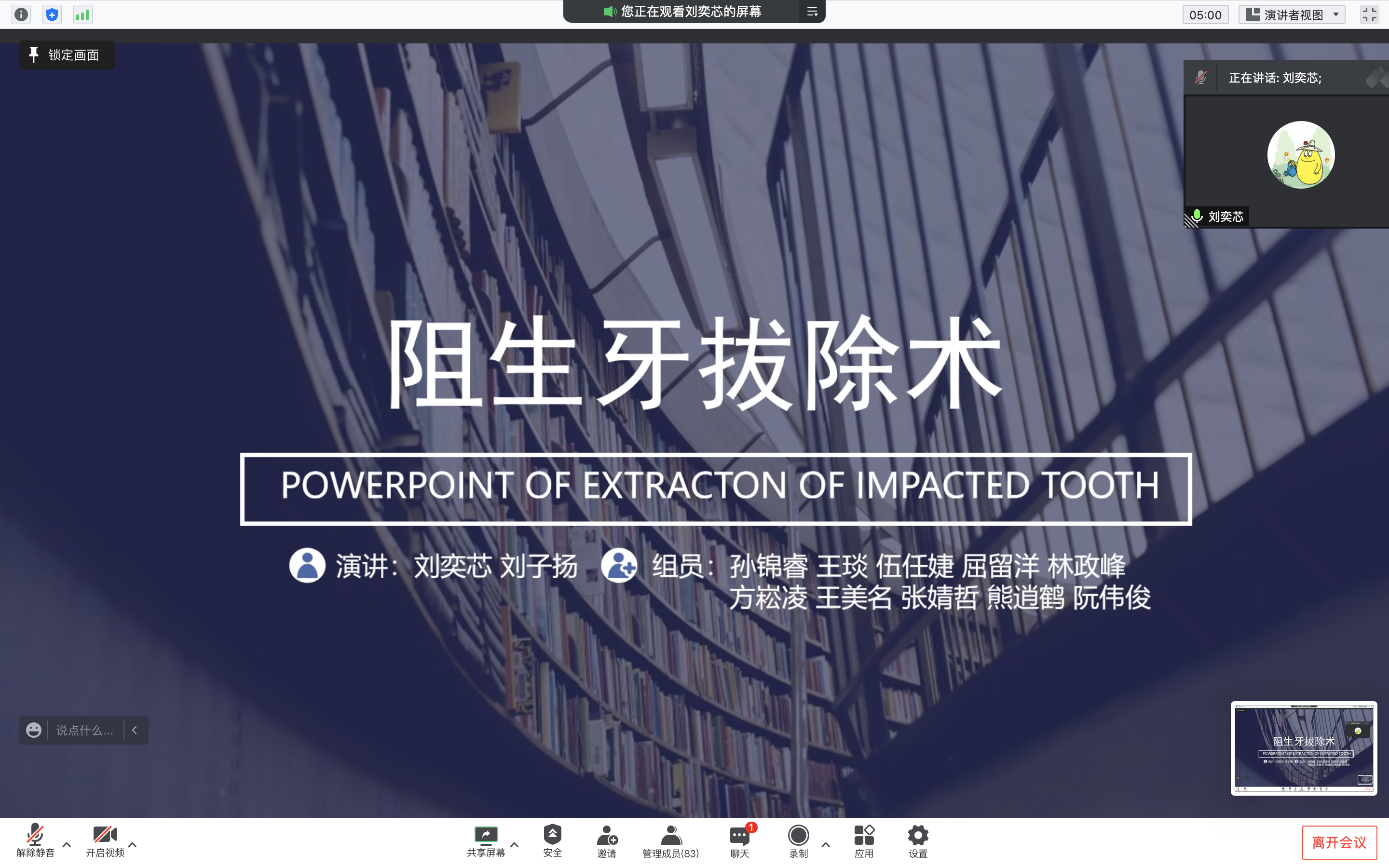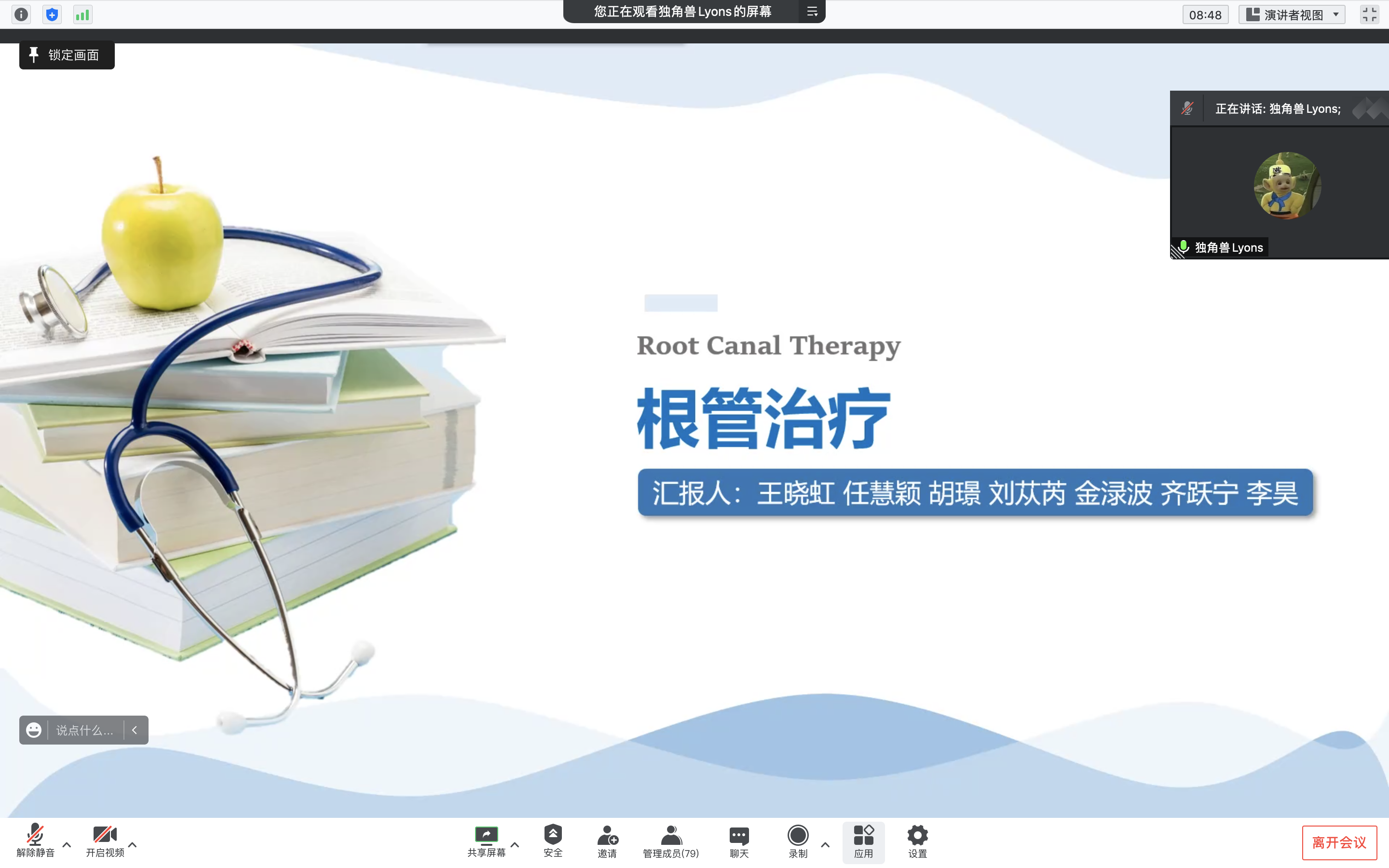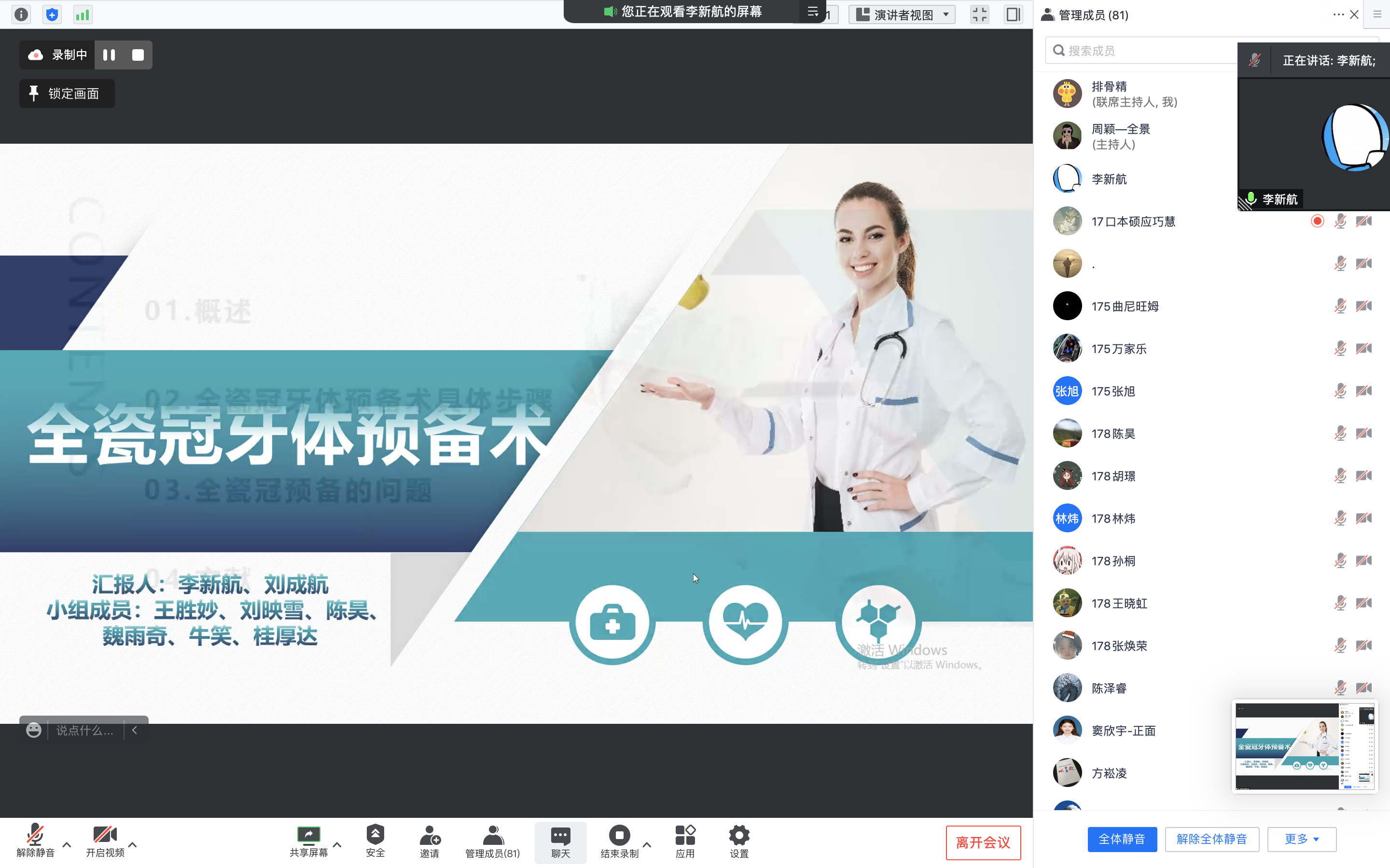 除了常规的教师团队授课,“云端”实习教学还创新性实践了“翻转课堂”模式,运用师生角色互换的教学组织方式将课堂还给学生,让学生主动参与教学。实习学生按照既定实习小组的划分,由教师团队指导学生团队进行授课。授课主题为教师团队协商指定,根据口腔实习医师常见的临床技术操作提出问题,内容涵盖口腔颌面外科学、口腔修复学、牙体牙髓病学、牙周病学等专业。各授课小组内部分工有序,同学们按照问题分头收集资料,查阅文献,认真研讨,齐心协力共同制作课件。每组指派2-4名同学代表本组进行线上授课,本组内所有同学均须发言,并由指导教师团队在授课结束后进行点评与指导。学生授课代表李新航、刘奕芯、王晓虹、王冠儒等二十余名同学相继带来了基于临床常见技术操作的精彩讲座,学生代表们各尽所能,各展其彩。课后教师团队针对学生们的汇报内容进行了详尽的点评与指导。教师团队倾囊相授,不吝赐教,师生讨论互动环节亦生动热烈、学习氛围浓厚。“翻转课堂”模式的创新性实践作为学生们临床实习的阶段性总结,突出了学生的主导性,使其从被动接受转为主动探究,充分调动了学习积极性。同时激发了学生的学习潜能,开拓思维,提高了团队协作能力,营造出浓厚的学习氛围;也增强了师生间互动,拉近了老师与学生的距离。学生们对这种创新性教学模式表示出极高的认同感,教学满意度高。