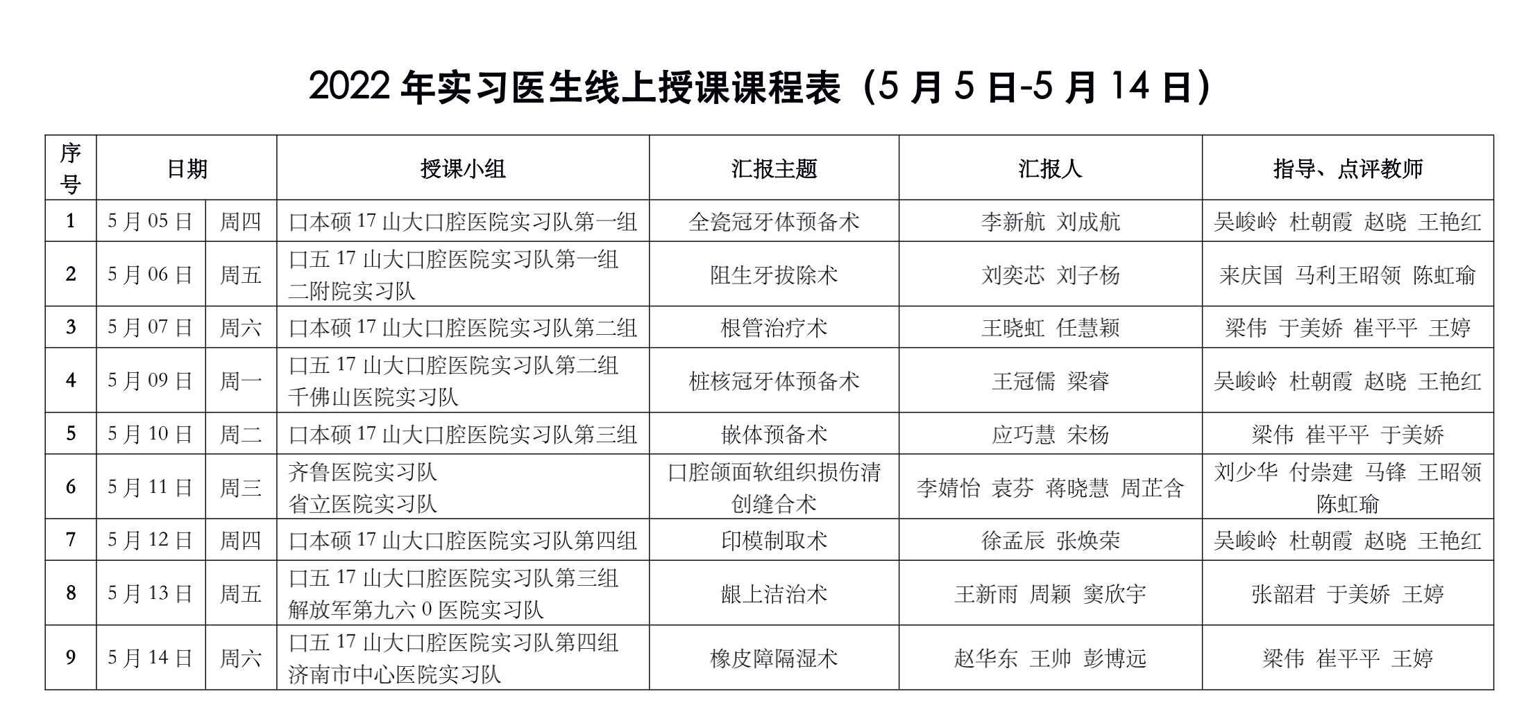 在学院领导的指导和相关职能部门的配合下,临床实习线上教学由院本部临床实习教学基地(口腔综合科)负责组织实施。科室迅速成立了“云端实习”教务组,根据以往线上教学模式的经验积累,紧扣临床实习大纲,及时制定了《2022届本科生临床实习教学线上授课计划表》;并组建了由学院(医院)、山东大学齐鲁医院、山东大学第二医院、山东省立医院、山东省千佛山医院、济南市中心医院、九六零医院实习基地带教经验丰富的骨干教师组成的“云端实习”教师团队。线上教学对于实习带教团队来说已不陌生,教师们在繁重的临床工作之余,精心备课,借鉴以往的线上教学经验,与时俱进融入新元素、新形式,高标准,严要求,精心设计课件及互动问题,确保课程内容达到与线下实习教学相同的质量与效果。授课内容从临床实践出发,以病例分析与基本临床操作为抓手,引导同学们将理论知识灵活运用到临床实践中。由齐鲁医院刘少华、千佛山医院张韶君、第二医院来庆国、省立医院马利、济南市中心医院马锋、九六零医院付崇建等众多经验丰富的教授带来的系列讲座精彩纷呈,开阔了学生的视野,极大提升了学生们的临床思辨能力。“云端实习”模式受到了学生们的一致好评,学生们的学习兴趣浓厚、热情高涨,出勤率高达100%,且课后咨询请教不断,跟随讲课教师在知识的“云端”遨游。