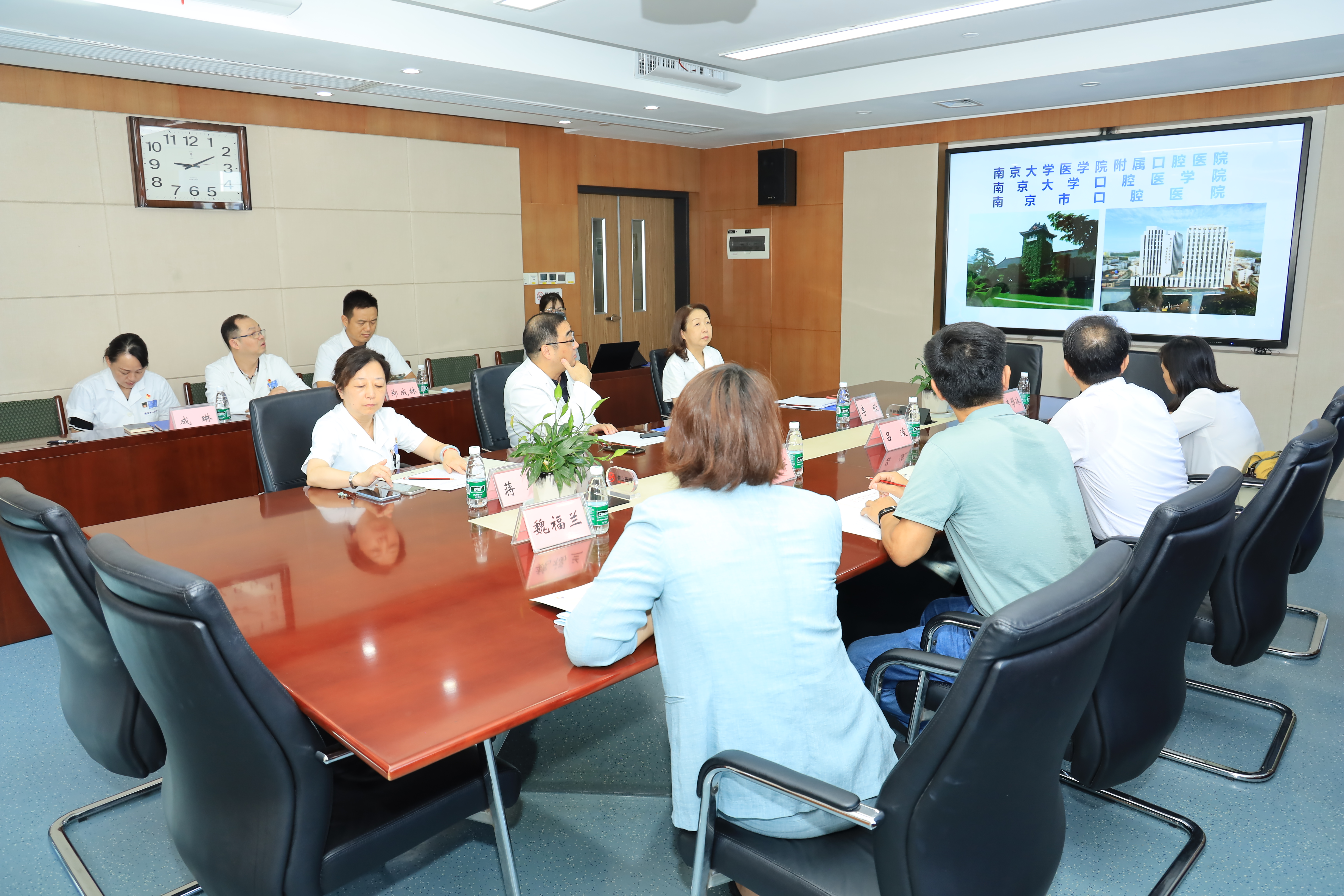 10日上午,吕波一行来到南京大学医学院附属口腔医院,院党委书记王磊向大家介绍了医院的历史沿革、基本情况、学科建设、临床专科、医疗质量和文化理念等方面的特色和亮点。吕波表示,作为历史最悠久的五大口腔专科医院之一,医院在“1+5+2”医疗服务模式、患者职工“双满意”医院文化、医疗服务大查房、青年能力提升计划、改善医疗服务水平等多方面的有益探索做到了“想在前,走在先”,起到了重要的引领和示范作用,为我院未来的发展规划起到重要的借鉴意义。随后,吕波一行参观了临床医技科室、职工之家、虚拟仿真教学中心、图书馆和院史文化走廊等。