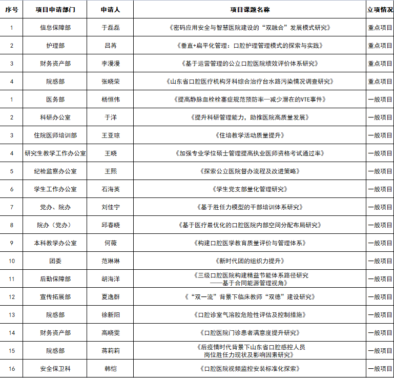 在20个被立项的项目中,有的聚焦医院信息化建设,探索密码应用安全与智慧口腔医院建设的“双融合”发展模式;有的立足立德树人,围绕提高执业医师资格考试通过率、构建口腔教学管理评价体系等提升教学管理能力和教学质量;有的着眼于精细化管理,思考进行视频监控安装标准化研究、精益节能体系路径研究、运营管理绩效评价研究,应用于工作实际;有的着力打造亮点品牌,凝练出适应口腔特色的“师德师风、医德医风”建设、护理管理模式、督办工作流程和感控举措。20个项目既有围绕专业理论的课题研究,又有聚焦具体工作的创新实践,经过评选4个项目被确立为重点项目,16个项目被确立为一般项目。