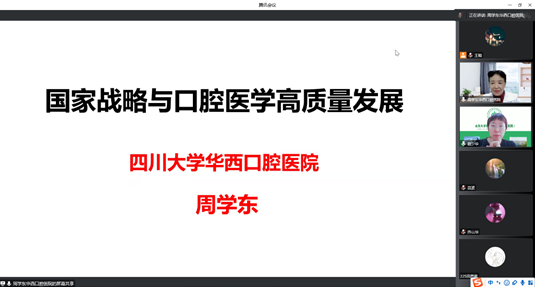 11月9日下午,由山东大学齐鲁医学院主办,山东大学口腔医学院承办的“齐鲁医学大讲堂”活动以线上方式举办。活动邀请了四川大学华西口腔医院学术院长、口腔疾病研究国家重点实验室主任、中国口腔医学博物馆馆长周学东教授作了题为《国家战略与口腔医学高质量发展》的讲座。学院(医院)党委书记吕波参会并致辞,院长葛少华主持。齐鲁医学院共90余名师生及管理工作人员参加了讲座。