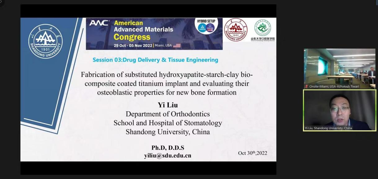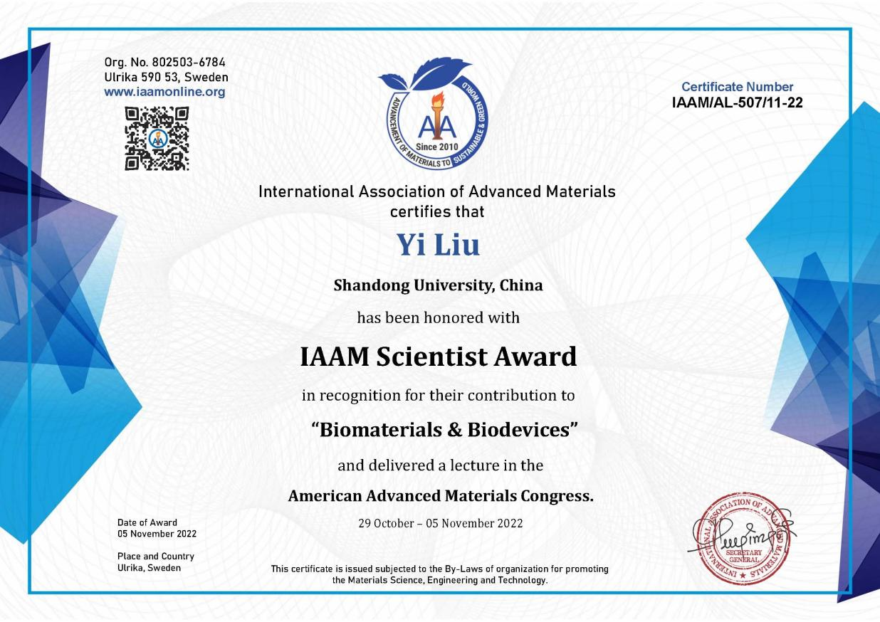 近日,口腔医学院(口腔医院)正畸科刘毅副教授荣获国际先进材料协会(IAAM)颁发的2022年度国际先进材料协会科学家奖(IAAM Scientist Award),以表彰其在“Biomaterials & Biodevices(生物材料与生物设备)”领域的学术贡献。同时,刘毅受邀线上参加了在美国迈阿密举行的2022年美国先进材料年会(AAMC)并做了题为“Fabrication of substituted hydroxyapatite-starch-clay bio-composite coated titanium implant and evaluating their osteoblastic properties for new bone formation”的大会报告,得到了与会者的高度关注和认可。