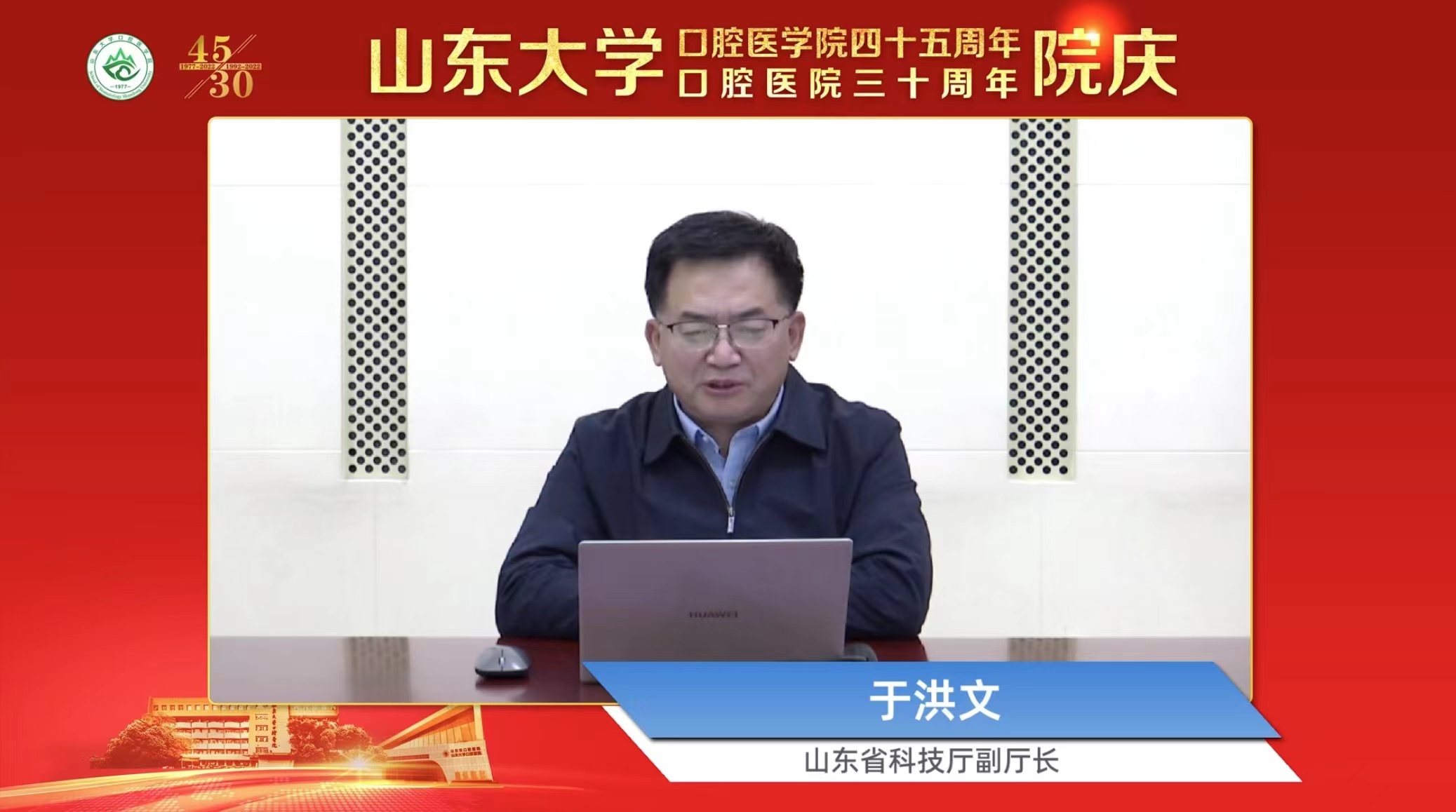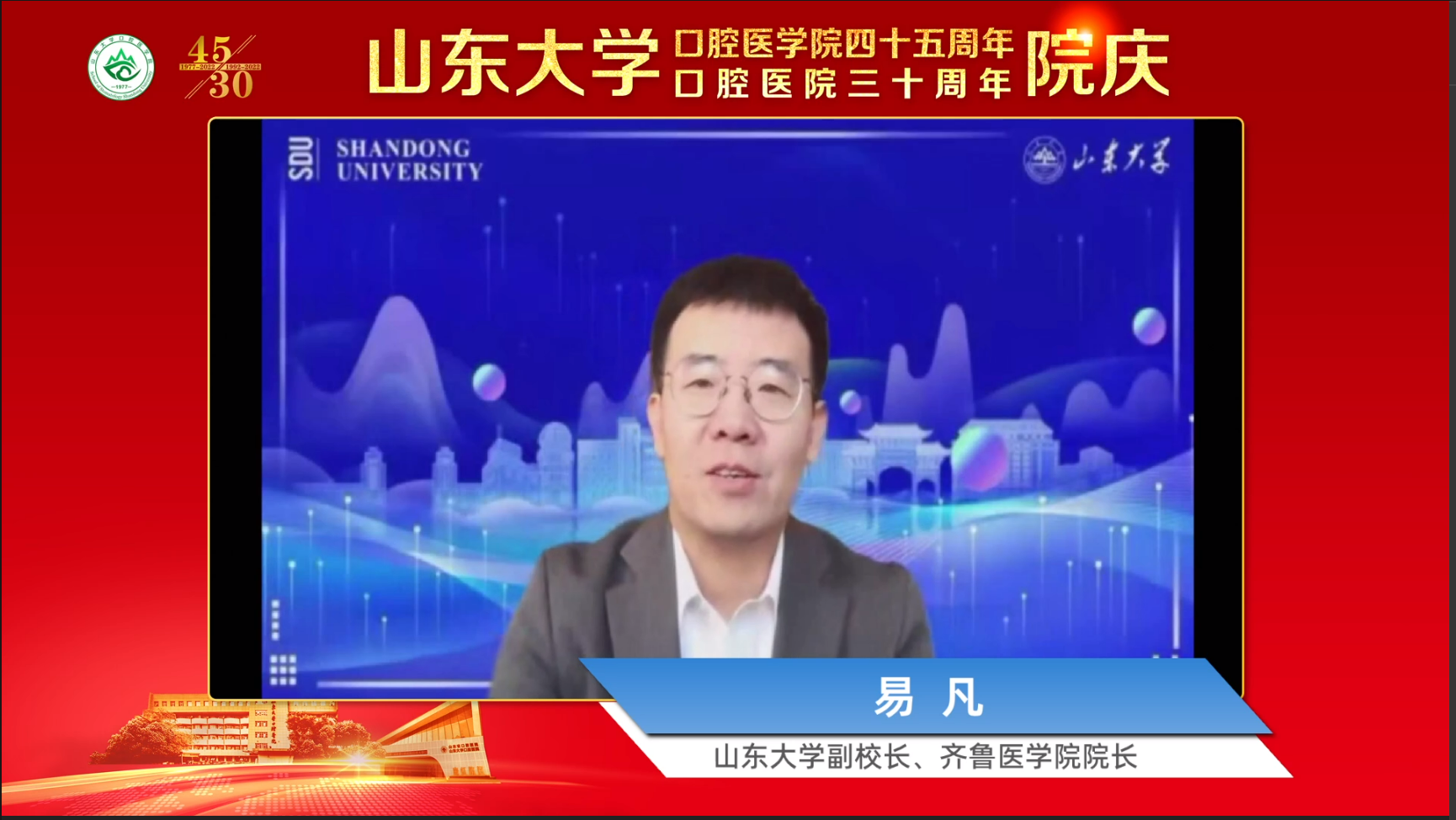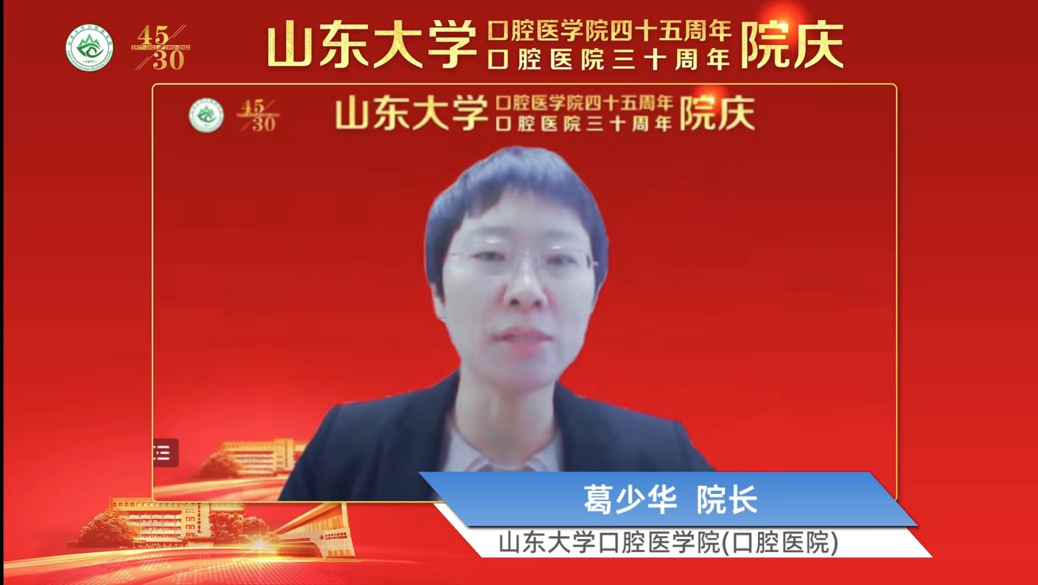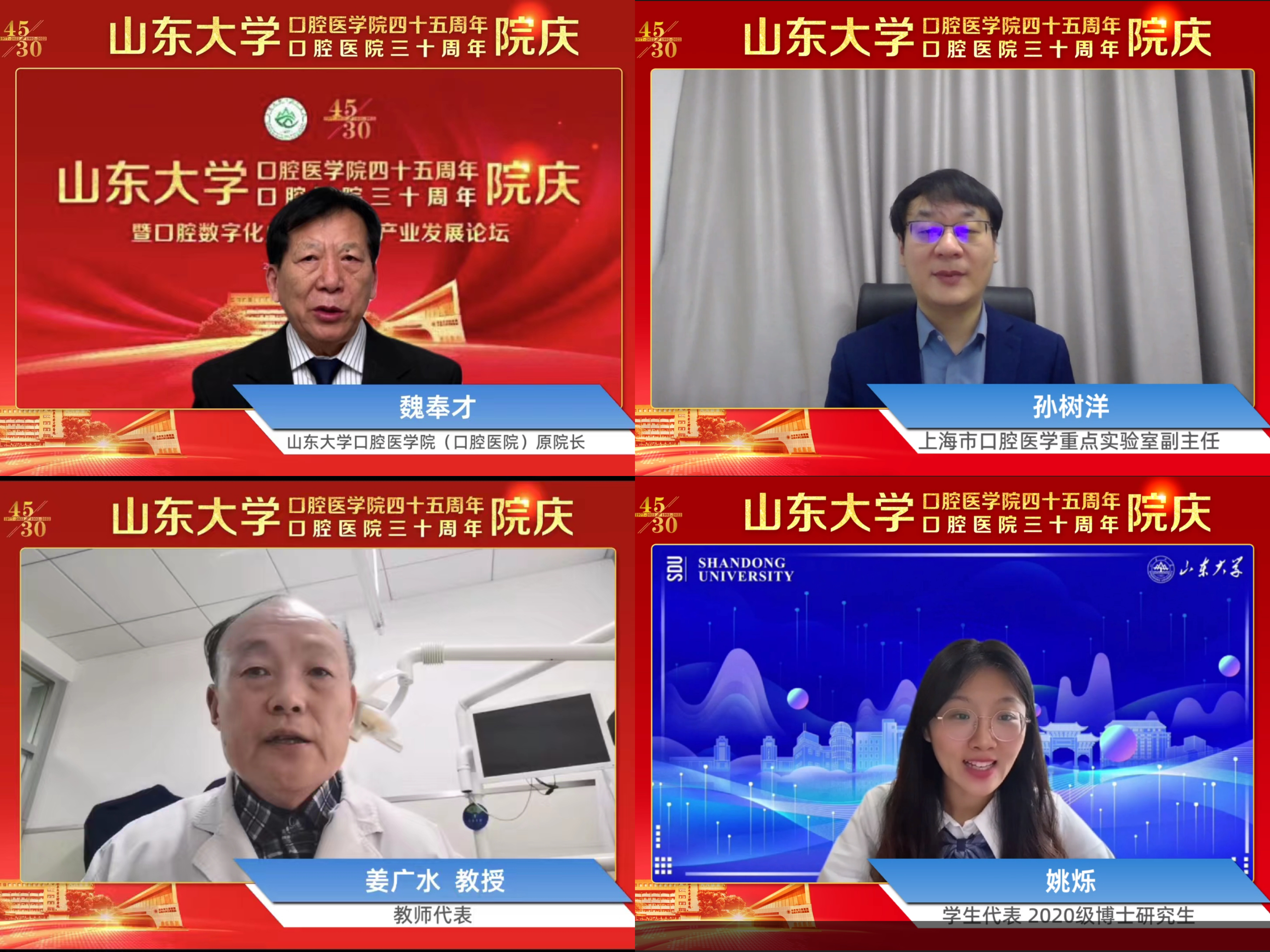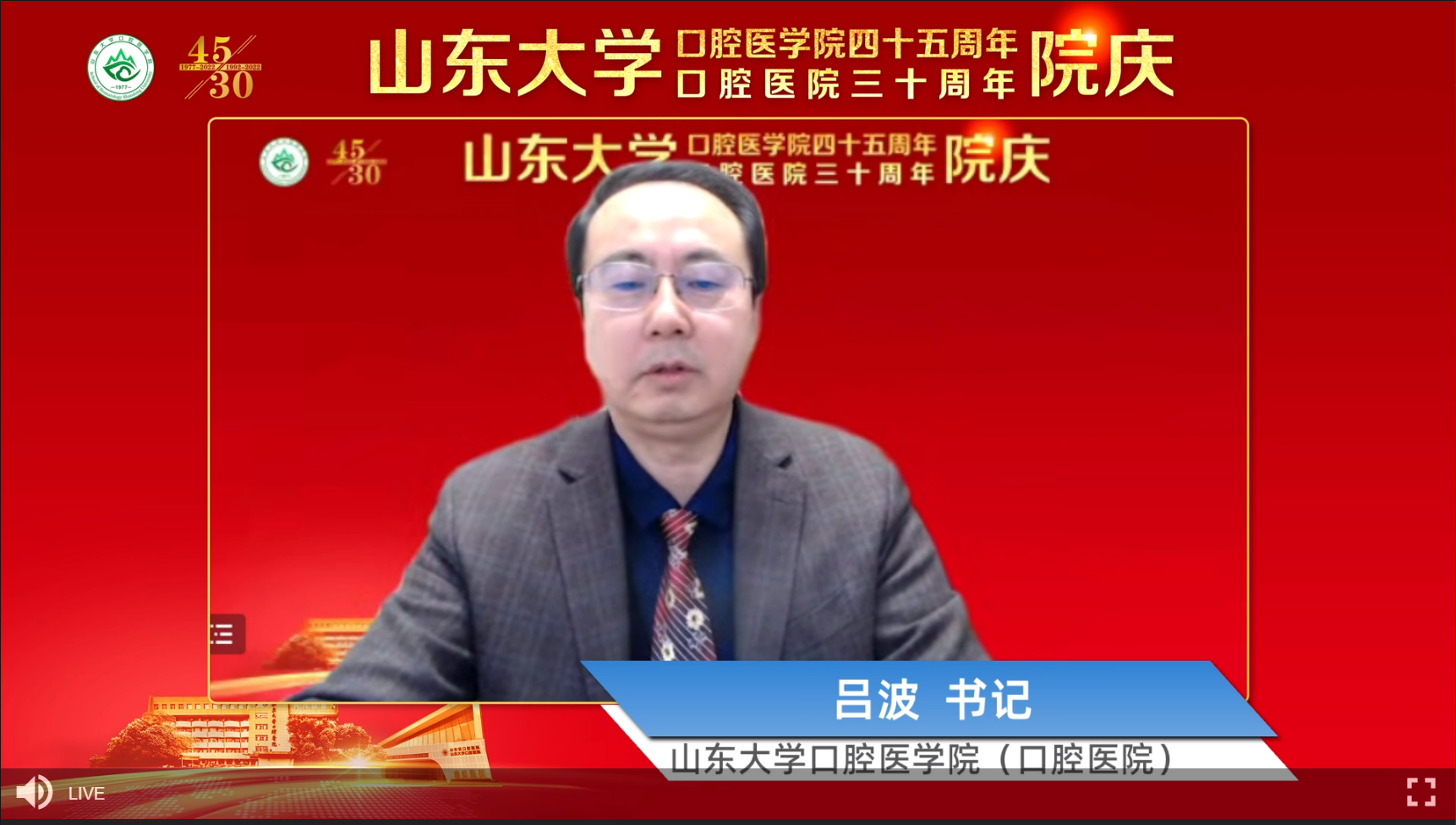 12月23日,山东大学口腔医学院建院45周年、口腔医院建院30周年院庆大会通过“云端”隆重举行。中国科学院院士、首都医科大学副校长王松灵院士,中国工程院院士、军事口腔医学国家重点实验室主任赵铱民院士,中华口腔医学会名誉会长俞光岩教授,中华口腔医学会会长、北京大学口腔医(学)院院长郭传瑸教授,山东省科技厅副厅长于洪文,山东省卫健委二级巡视员刘桂刚,山东大学副校长、齐鲁医学院院长易凡教授,口腔医学院(口腔医院)院长葛少华教授出席大会。来自各兄弟单位及合作单位领导、专家学者,学院领导班子全体成员以及离退休教师代表、师生代表、校友代表等共同线上参会。大会由院党委书记吕波主持。