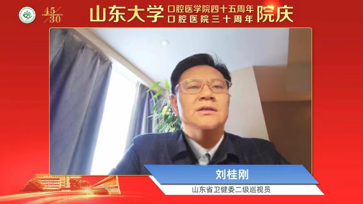 刘桂刚代表山东省卫生健康委员会对学院(医院)全体师生医务员工表示节日的祝贺,对支持、帮助山东省医疗卫生事业发展的各界人士表示衷心的感谢。他表示,山东省卫健委高度重视口腔健康事业发展,期望学院(医院)能以院庆活动为契机,全面贯彻落实党的二十大各项决策部署,围绕“推进健康中国建设”各项任务,坚持以人民为中心的发展理念,发挥公立医院公益属性,努力开创山东省口腔医疗卫生事业发展新局面!