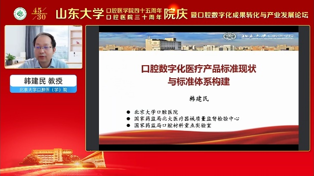 全国口腔材料和器械设备标准化技术委员会秘书长、北京大学口腔医(学)院韩建民教授、山东省药品监督管理局注册处处长曹森、山东省医疗器械和药品包装检验研究院院长施燕平研究员、山东大学科学技术研究院副院长刘德宝、山东大学口腔医学院(口腔医院)院长葛少华教授、山东省立口腔医院院长张东升教授、青岛大学附属医院口腔医学中心主任邓婧教授、青岛市口腔医院院长王万春教授、济南市口腔医院院长杜毅教授、烟台市口腔医院院长柳忠豪教授、山东迈尔医疗科技有限公司董事长许小伟、山东沪鸽口腔材料股份有限公司副总经理张永静以及博恩集团数字化研发中心首席技术官杨俊受邀线上出席论坛。山东大学科学技术研究院院长周传健教授进行论坛主题介绍并致辞,山东大学口腔医学院(口腔医院)副院长宋晖教授和口腔修复学教研所所长蓝菁教授主持论坛。