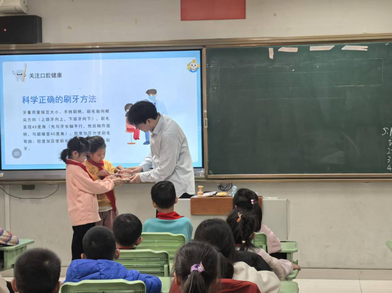 接着,主讲人何若阳通过趣味PPT,针对“如何正确刷牙”等小学生常见口腔健康疑惑,全面细致地为小朋友一一解答。为巩固效果,现场设置互动问答环节,“每天刷几次牙”等问题引发孩子们踊跃抢答,答对者获小礼品奖励,现场气氛热烈,孩子们学习积极性高涨。
