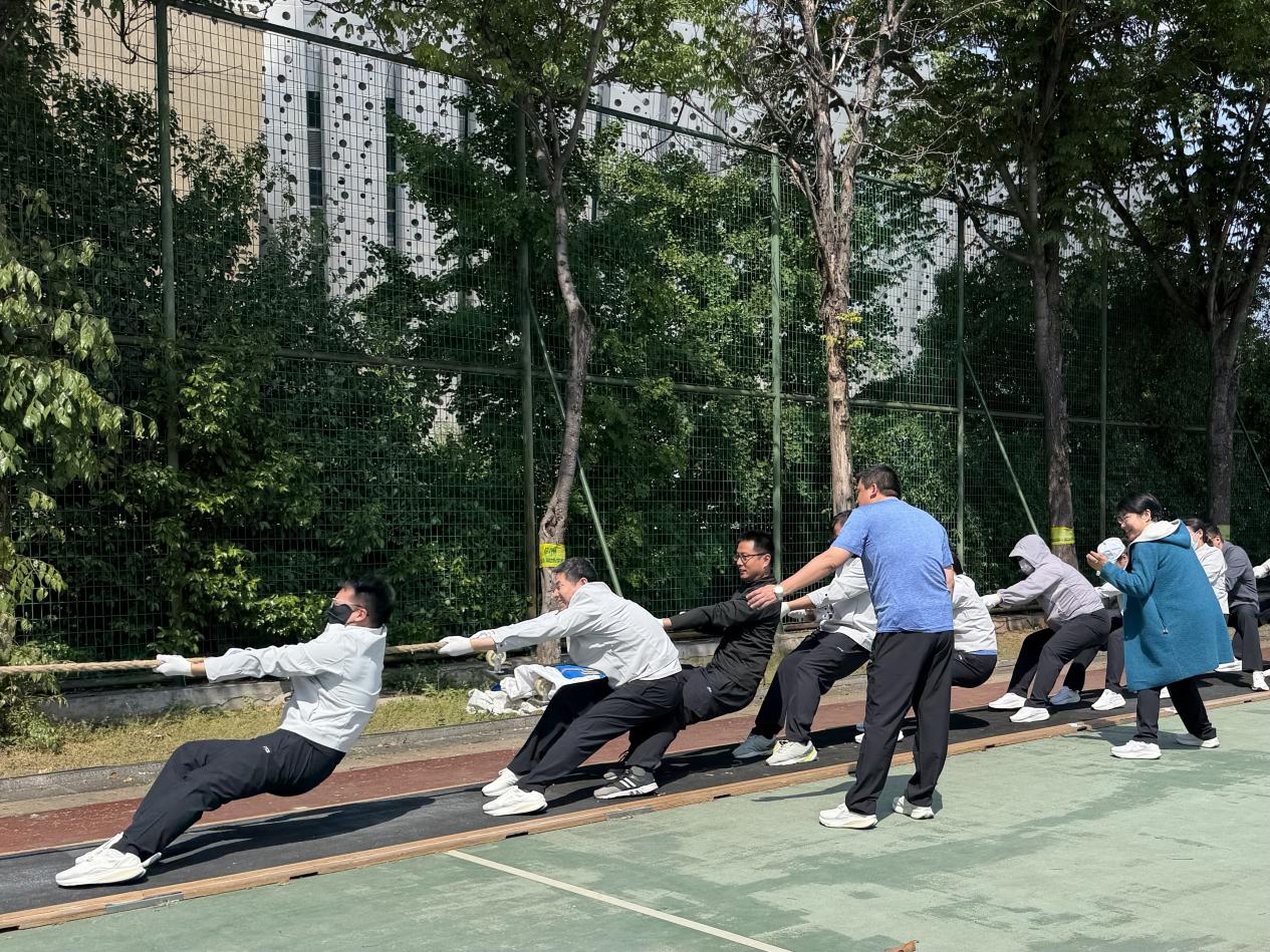 拔河比赛中,众人同心、紧握绳索,凝聚团结合力。