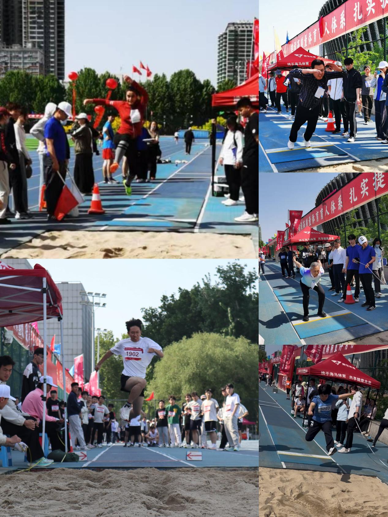 跳远沙坑前,纵身腾跃、蓄力冲刺,划出优美弧线。