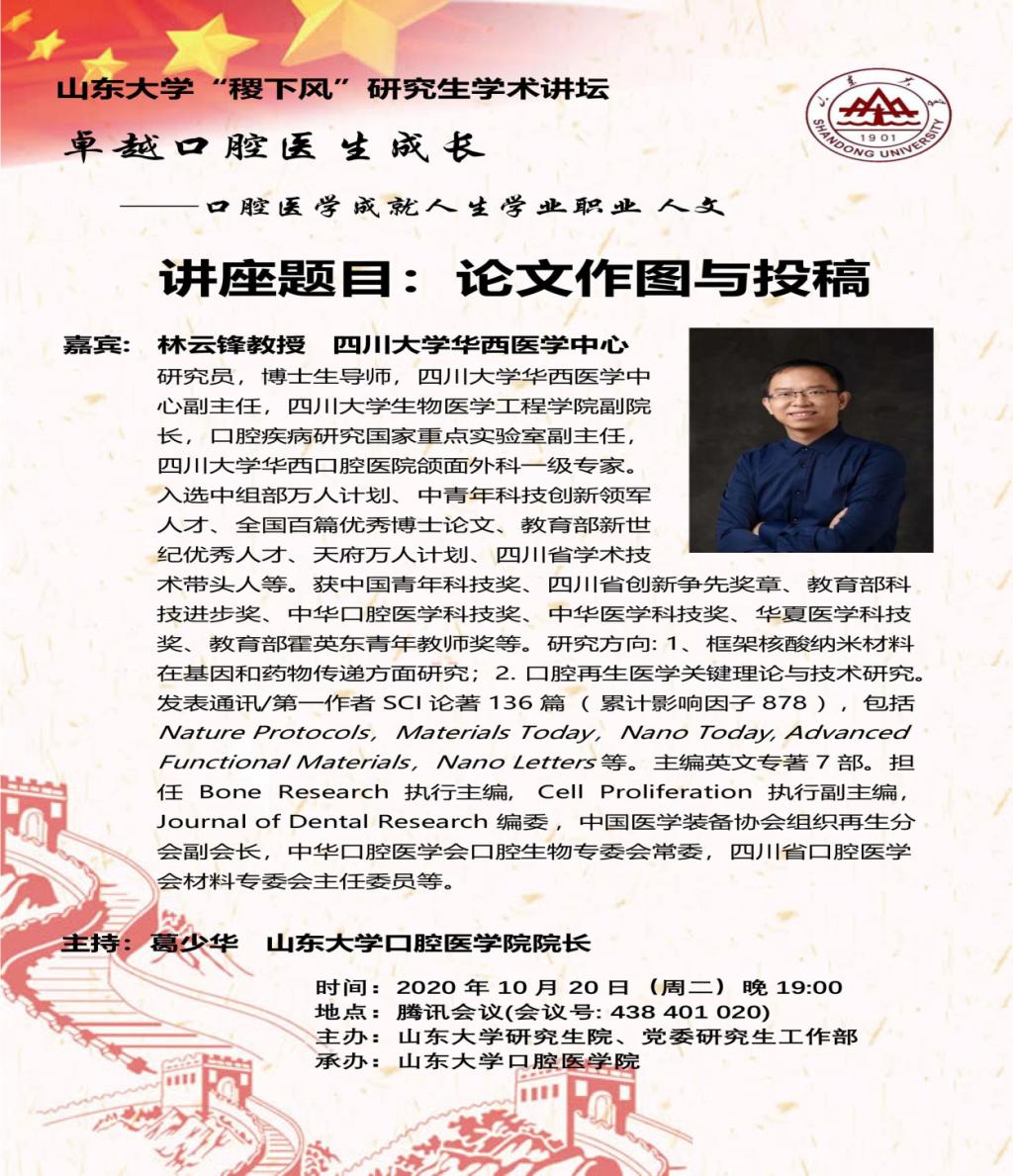 10月20日晚,山东大学“稷下风”研究生学术讲坛总第956期(2020年第34期)、“山东大学口腔医学院卓越口腔医生成长——口腔医学成就人生 学业 职业 人文”系列讲座------“论文作图与投稿”顺利举行。讲座以线上方式进行。讲座由山东大学研究生院、党委研究生工作部主办,山东大学口腔医学院承办。四川大学华西医学中心副主任林云峰研究员主讲,山东大学口腔医学院院长葛少华教授主持。口腔医学院各位老师、研究生、本科生以及学校其他老师、同学参加讲座。